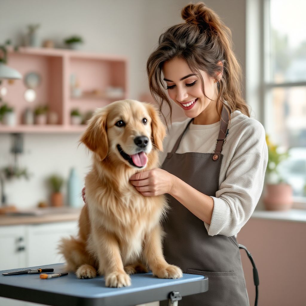 "Generate a high-resolution image of a professional dog groomer in a stylish and modern pet grooming salon. The groomer, a friendly woman in her mid-30s, wears a practical yet fashionable apron while carefully trimming a fluffy golden retriever’s fur. The well-lit salon has pastel-colored walls, a neatly organized grooming table with tools, and a large window letting in natural daylight. The golden retriever appears happy and relaxed. The scene should exude warmth, professionalism, and trust—perfect for branding and social media content."